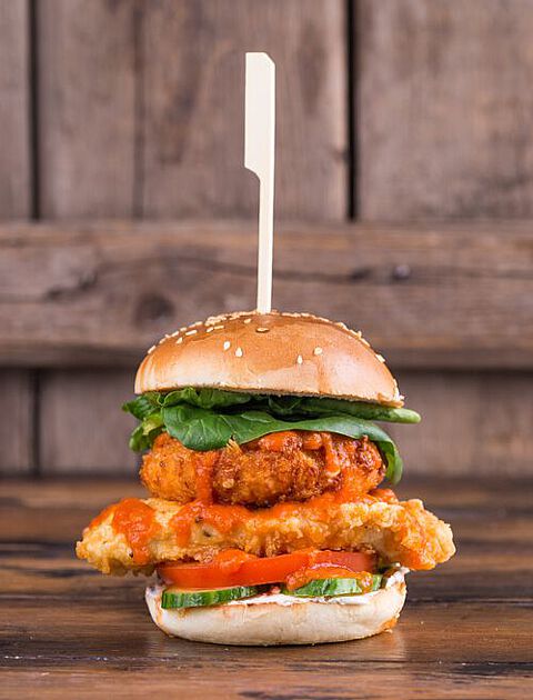 Куриное филе грудки, обжаренное в панировке, свежий огурец, помидор, творожный сыр на нижней булочке, сырная котлета, соус на основе томатов в собственном соку, листовой салат