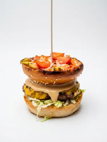 Бургер с говяжьей котлетой, сыром чеддер, помидором, соусом тар-тар